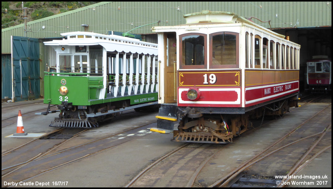 Manx Electric Railway Cars No 19 and 32 stand outside the Derby Castle Depot