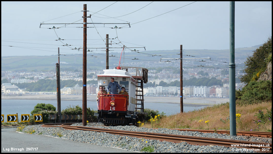 With the town below illustrating the climb out of Douglas, Car No 16 has just left the outskirts of Onchan with a tower wagon on a special working