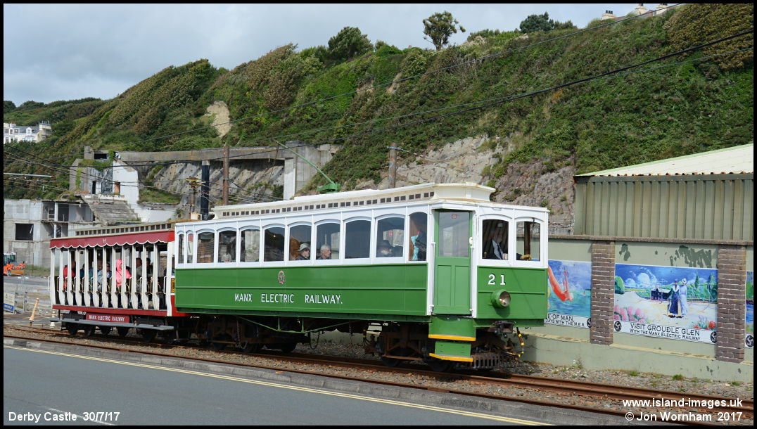 Car No 21 heading northbound past the depot with trailer No 44