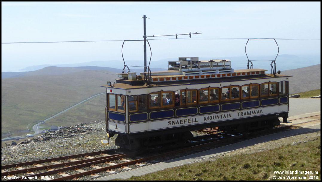 Car No 1 sets off for Laxey, with the Bungalow and Mountain Road visible below.