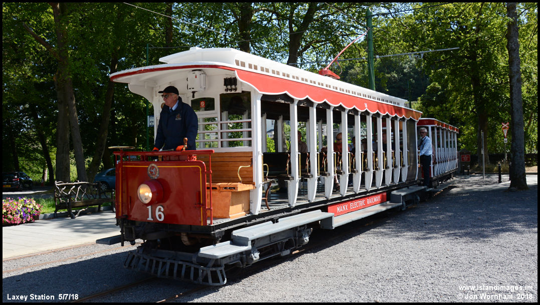 Manx Electric Railway open crossbench 'paddlebox' Car No 16 arrives at Laxey from Douglas, before heading onwards to Ramsey.