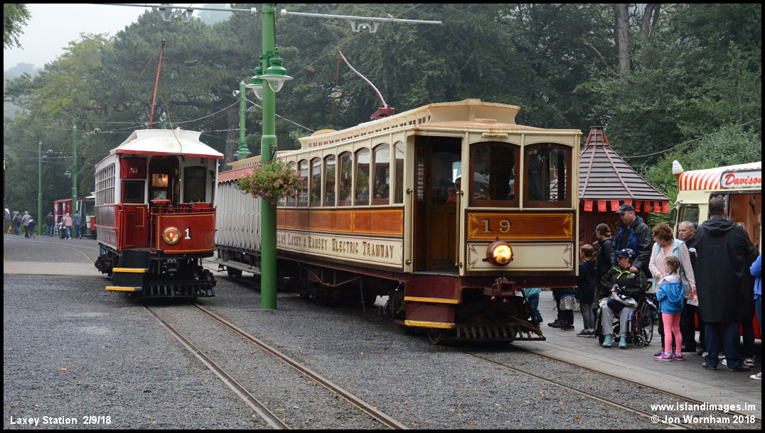 Back in Laxey station, Car No 19 is departing for Douglas while No 1 has arrived back from the Car Sheds.