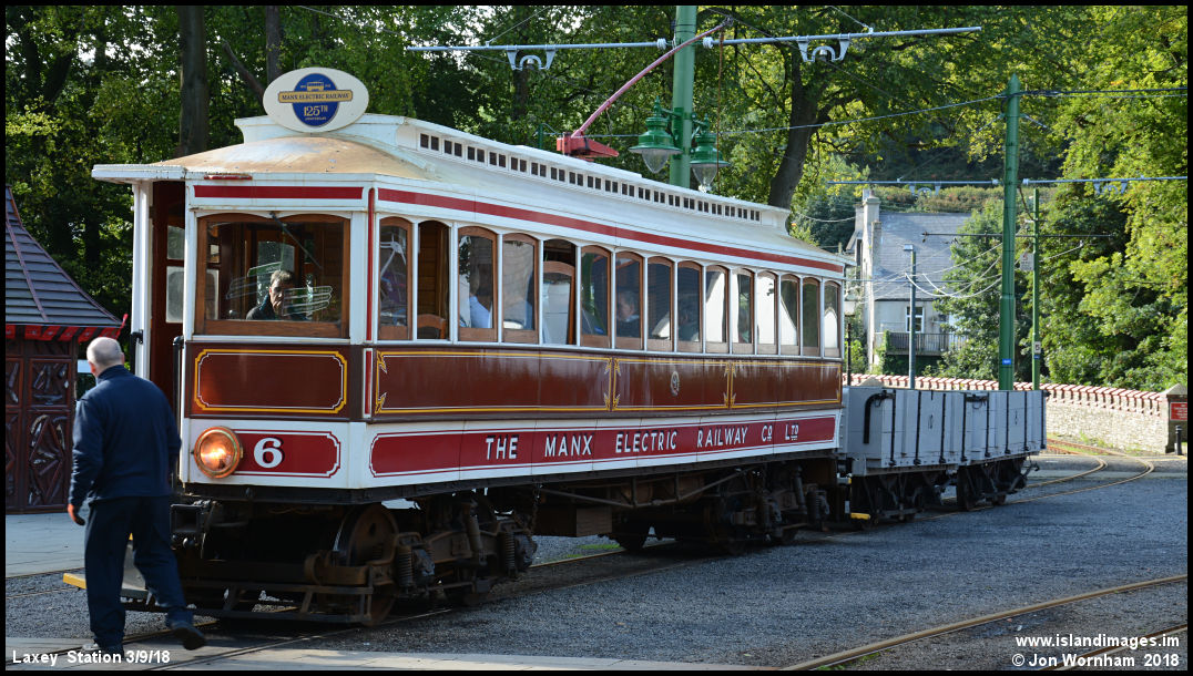 Car No 6 has just arrived at Laxey with another special working. This one is re-creating the days when the MER carried both passengers and freight and has two open wagons in tow.