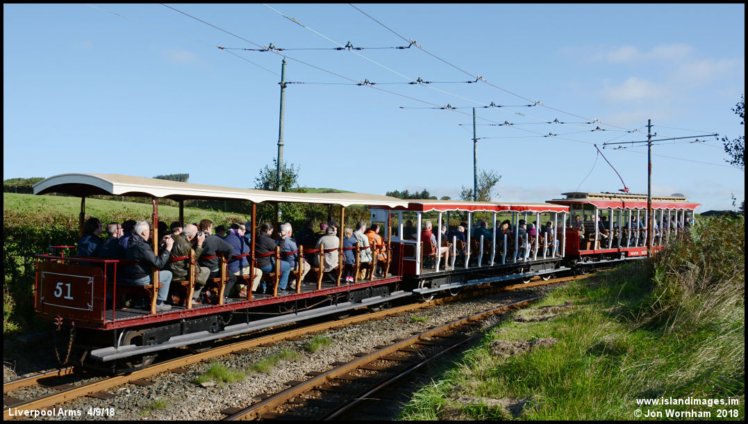 Three well loaded cars heading towards Baldrine. Trailer No 51 is one of the original six deleivered in 1893, No 60 is a little bit newer, being delivered in 1896.