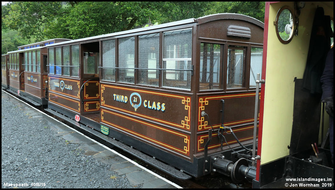 Coach No 21, a replica of an orginal Corris Railway vehicle. These were initially constructed as four wheeled coaches, but rebuilt onto bogie undeframes with a central entrance to the saloons.