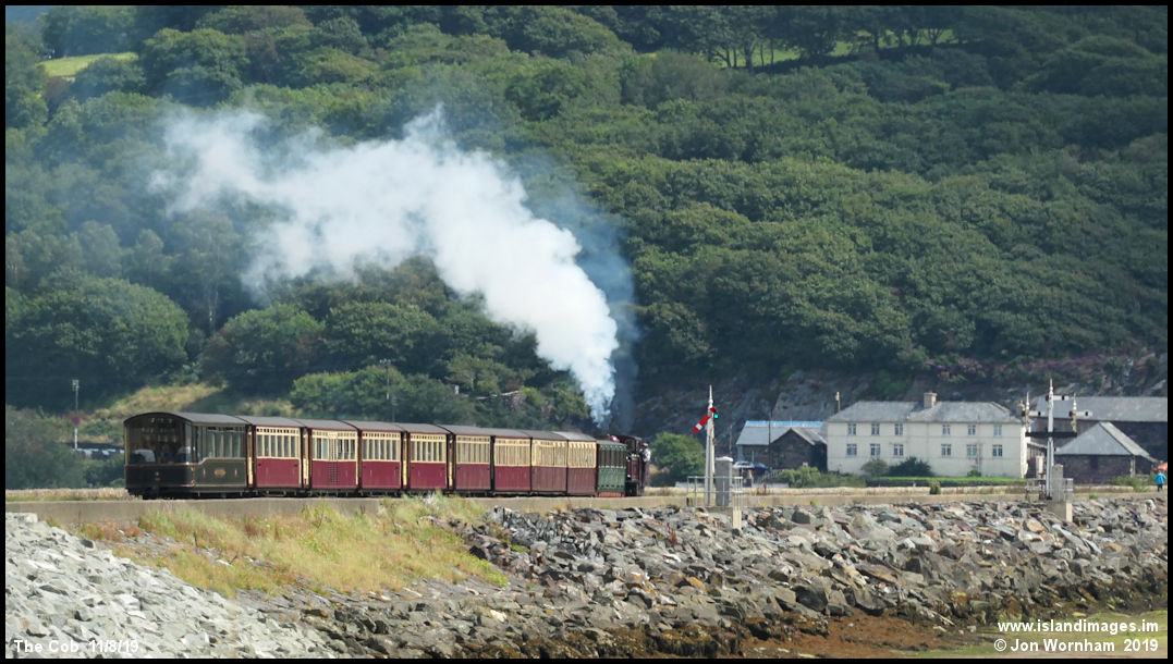 The Ffestiniog Railway train crossing The Cob towards Boston Lodge.