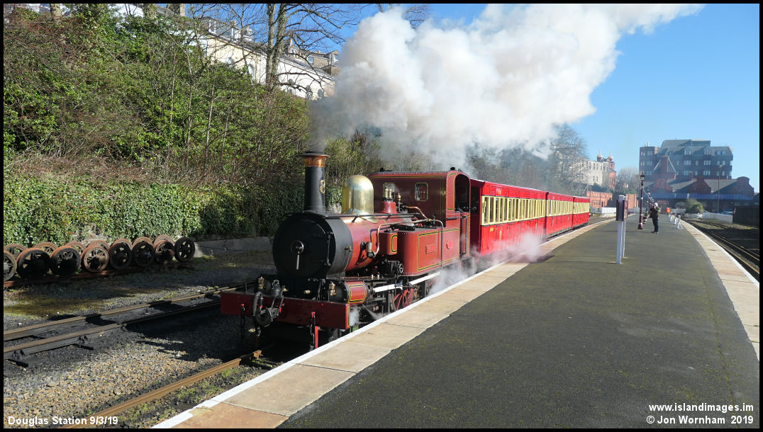 'Fenella' heads out of a sunny Douglas station, bound for Port Erin.
