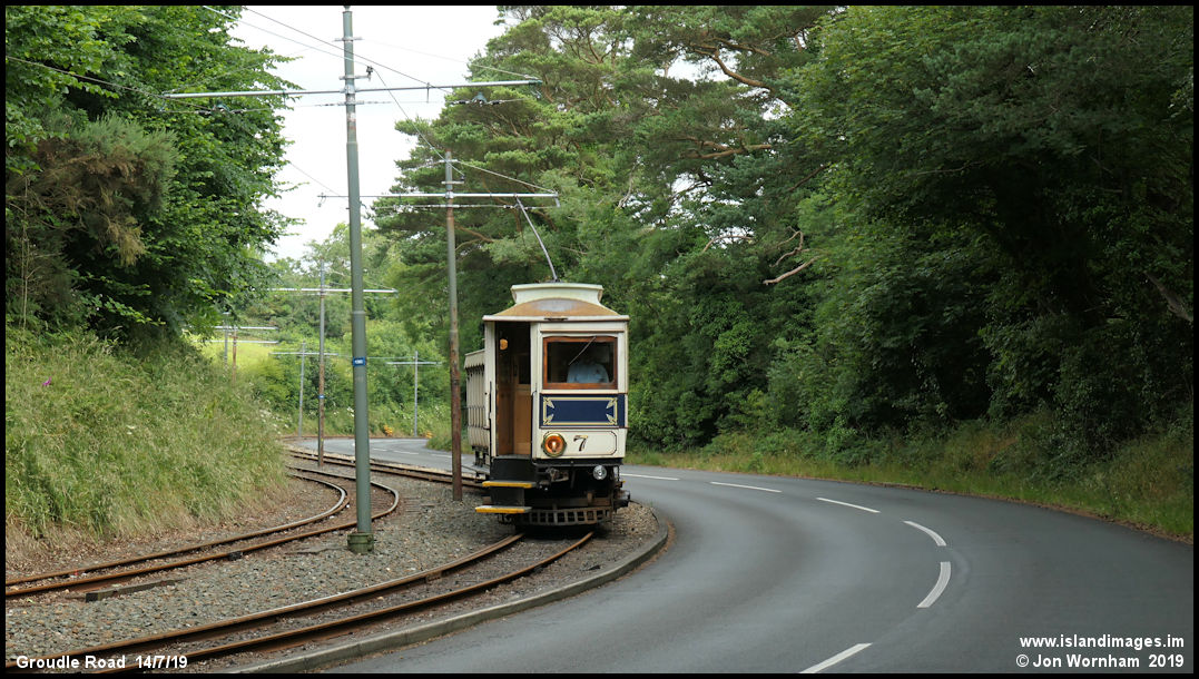 Manx Electric Railway Car No 7 runs alongside the Groudle Road.