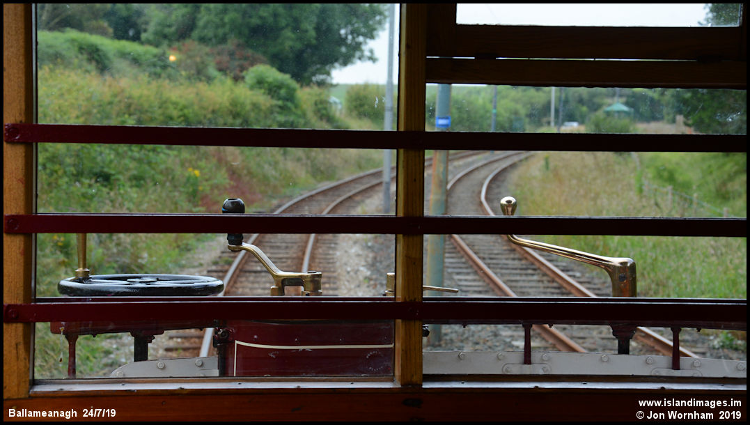 No air brake! A view through the bulkhead of the controls on Car No 14, crossing tracks at Ballameanagh insted of Groudle to fit in with other traffic.