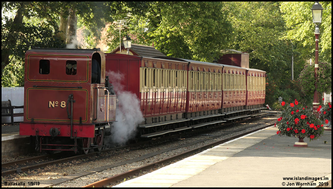 Isle of Man Railway No 8 'Fenella' stands in Ballasalla station after arriving from Castletown.