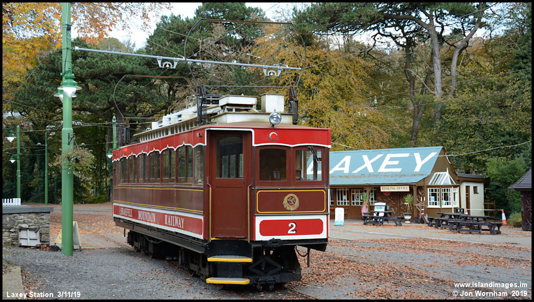 Snaefell Mountain Railway Car No 2 stands in an Autumnal Laxey Station.