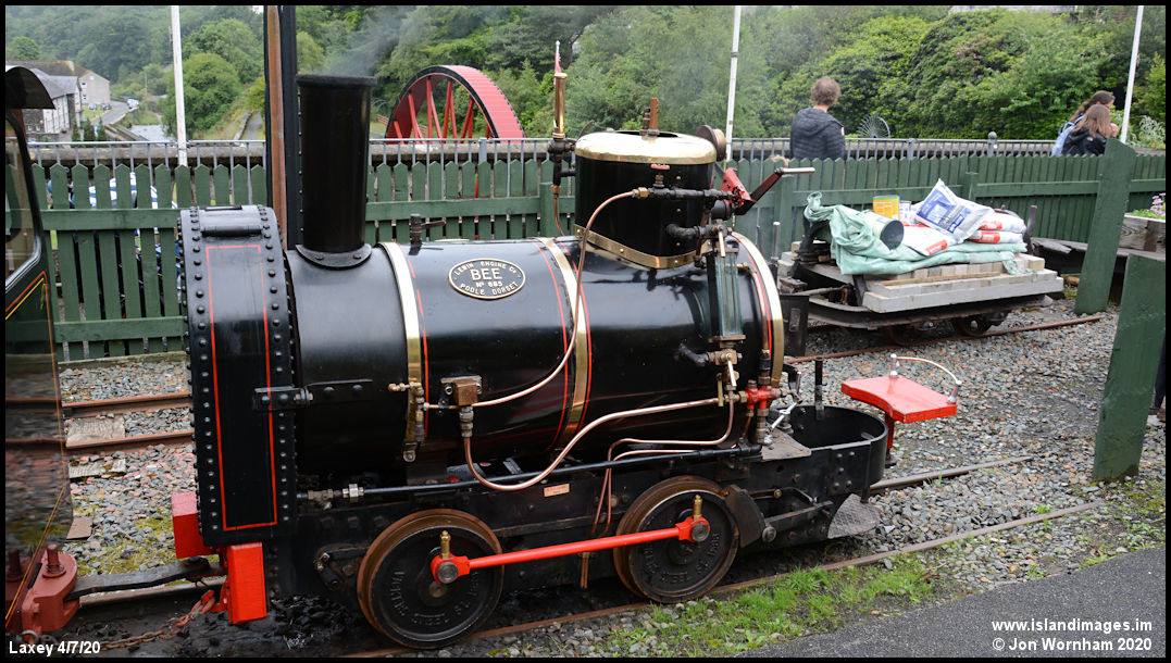 'Bee' at the Glen Gardens (Washing Floors) station with the Snaefell water wheel behind.