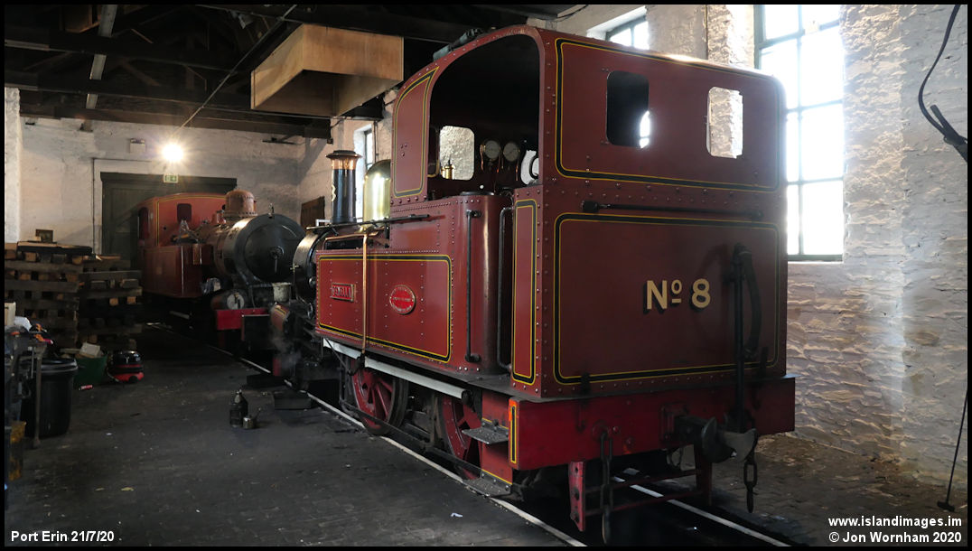 IOMR No 8 'Fenella' simers gently in the Port Erin engine shed. No 16 'Mannin' has been moved to the back of the shed.