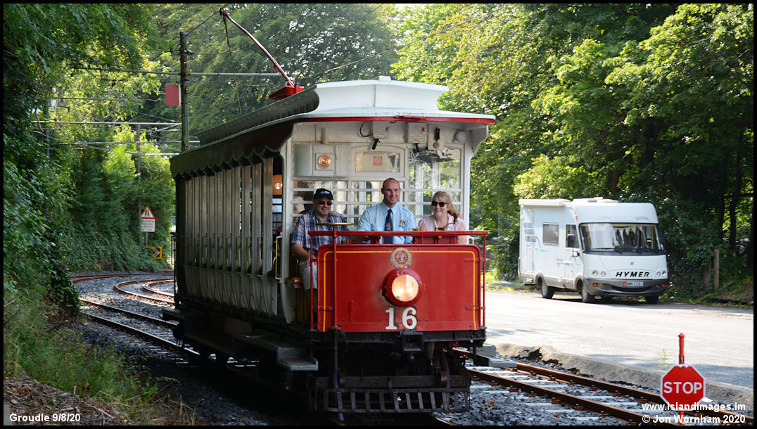 Car No 16 entering the Groudle station area, with a couple of lucky passengers getting a driver's eye view of the line.