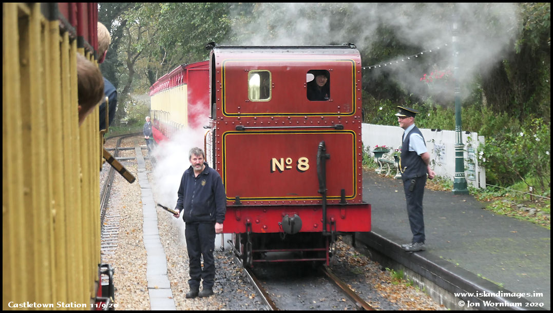 The weather had improved by the time we reached Castletown and crossed with the other train, hauled by No 8 'Fenella'. The single line staffs are about to be exchanged under the watchful eye of the Castletown Stationmaster.