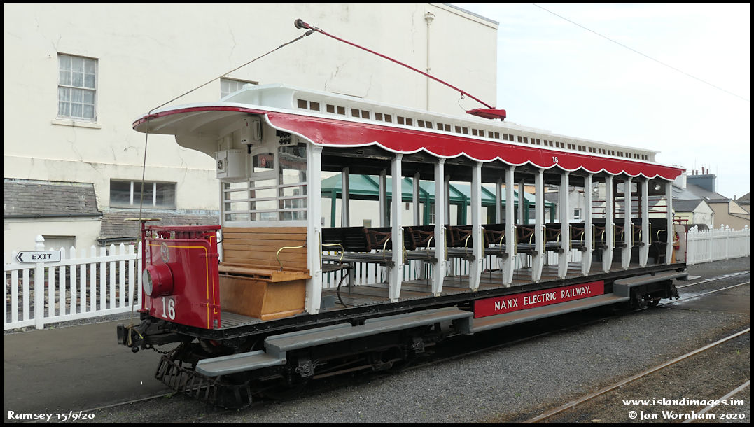Manx Electric Railway 'Paddlebox' open crossbench Car No 16 stands in the 'temporary' Ramsey terminus station. One of four cars delivered in 1898 and the only one equipped with air brakes.