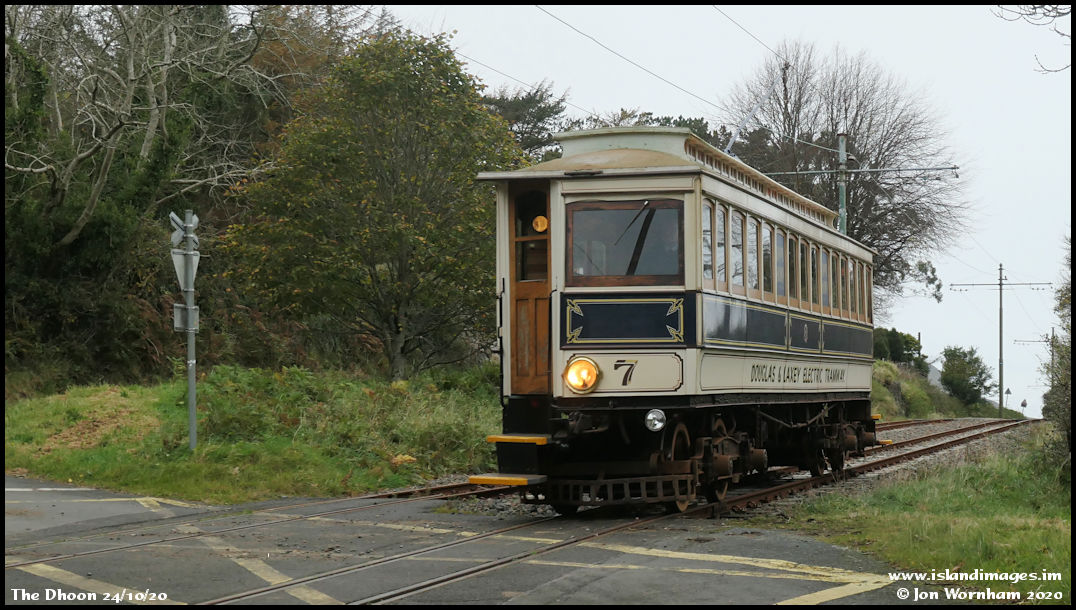 Car No 7 on one of the several minor road crossings here, much whistling is required from the tram!