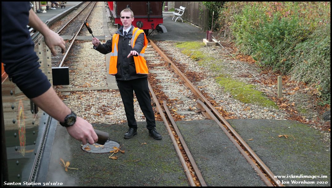 Ready to exchange the single line Staffs with the Santon stationmaster.