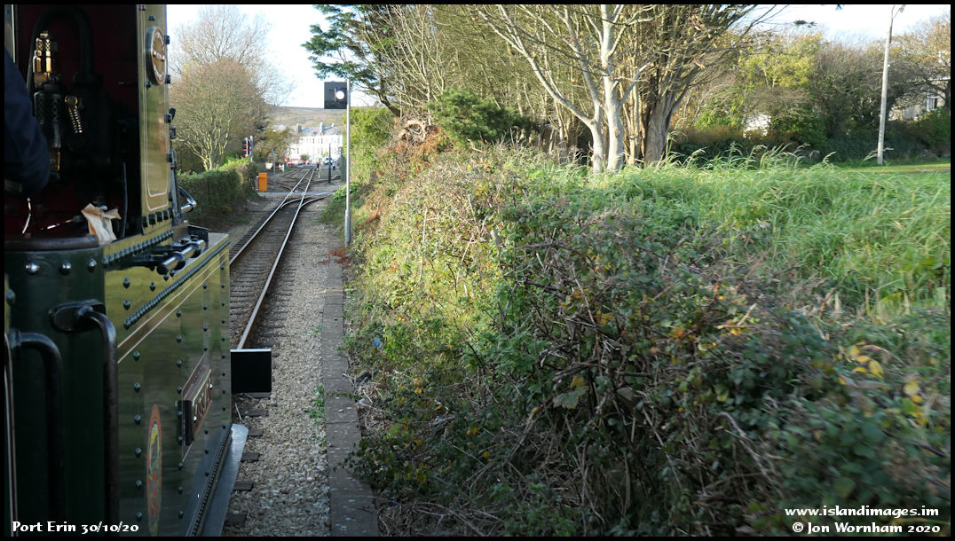 Approaching Port Erin, with the white light indicating that the level crossing barriers are down and it's safe to continue into the station.