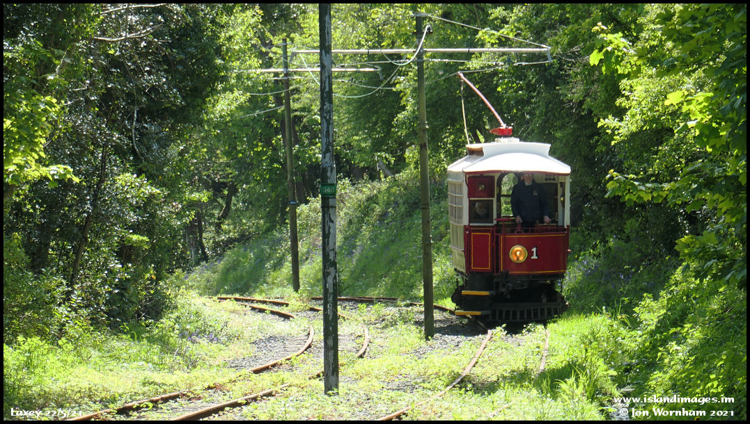 In very green surroundings, the final car out his morning is 1893 No 1, running down from South Cape towards Laxey with the 11:40 Derby Castle to Ramsey.