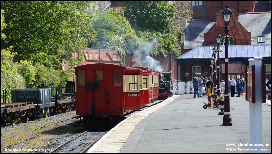 I had hoped to reach Douglas station before the train, but road traffic conditions dictated otherwise! As the last of the passengers leave the platform, 'Kissack' runs into the headshunt.