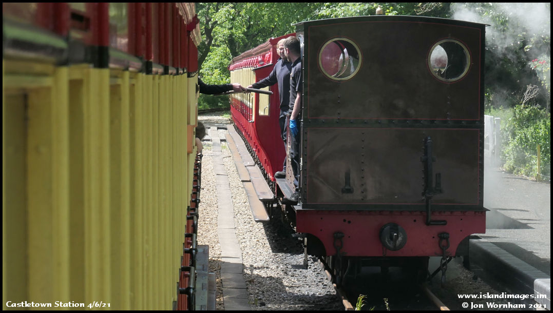 Crossing over with the Douglas bound train at Castletown, and crews exchange the single line staffs. MNR No 4 'Caledonia' is hauling the other train.