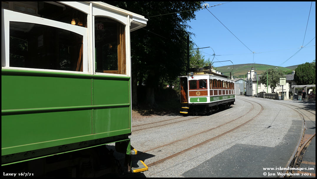 It's all green at Laxey as we have a pause to allow passengers to transfer to and from the Snaefell Mountain Railway, with SMR No 4 just arriving from the summit.