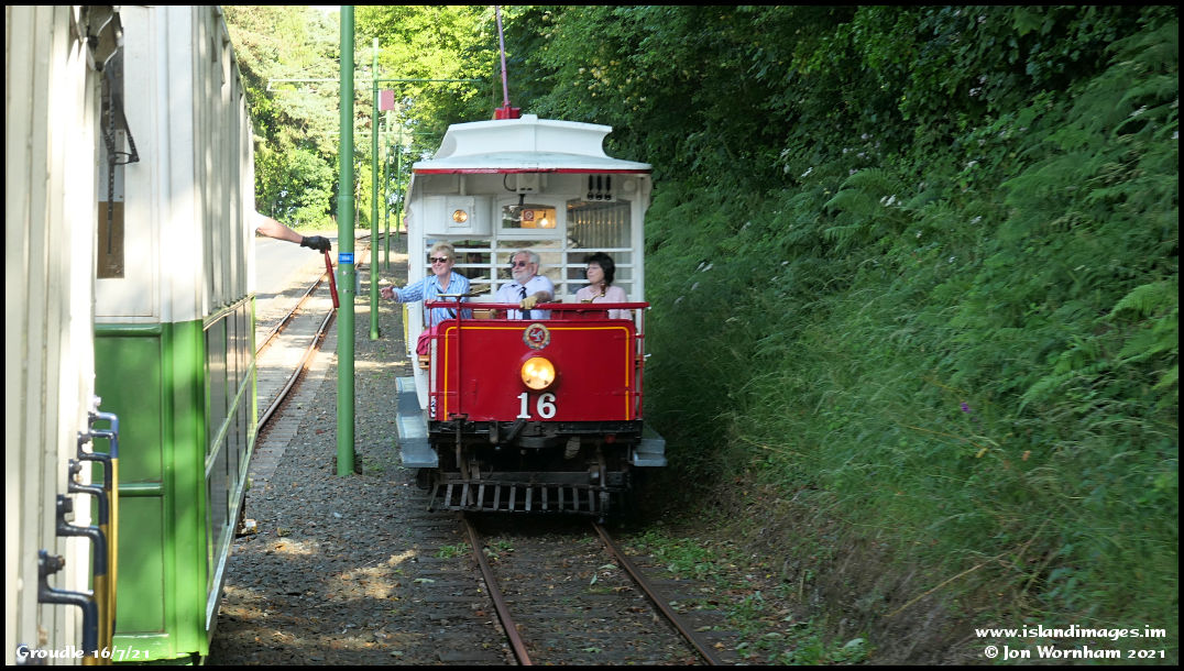 It' normally dangerous to lean out of the trailer, but here we were just crawling along having cleared the Groudle single line section, allowing me to get this shot of the single line Staff being passed to Car No 16.