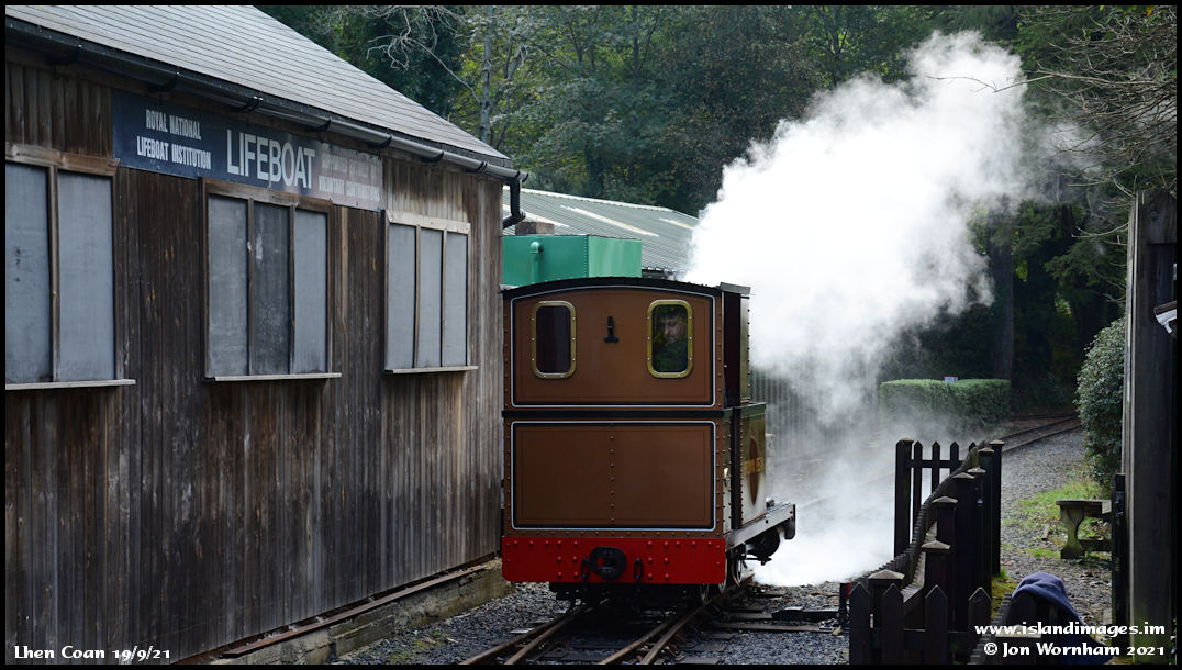 The morning sun highlights steam from 'Brown Bear', shunting in the glen terminus