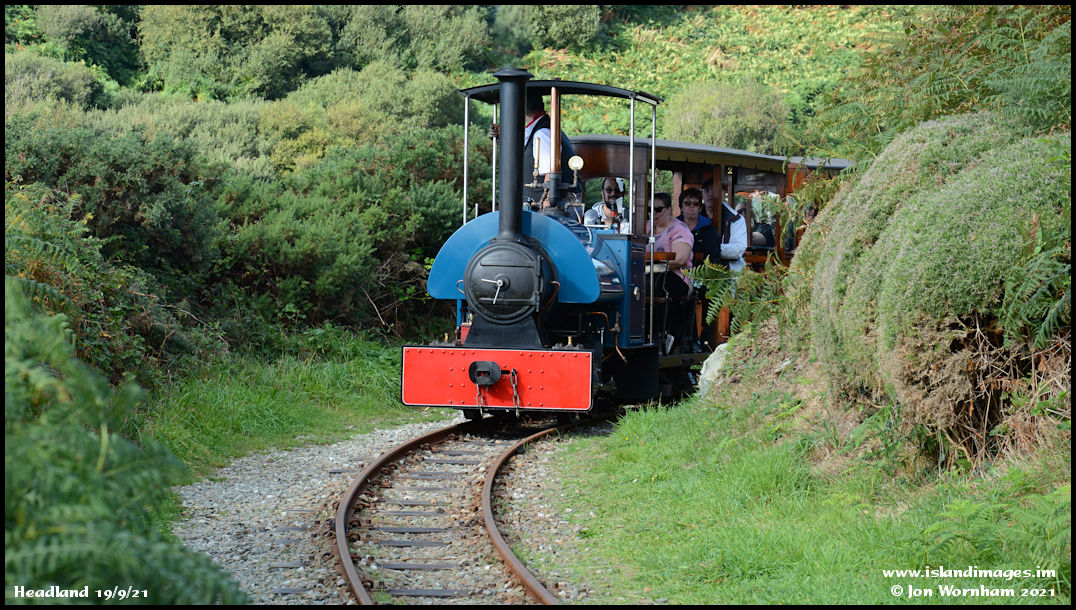 'Otter' rounds the curve between Lime Kiln Halt and the Headland Loop.