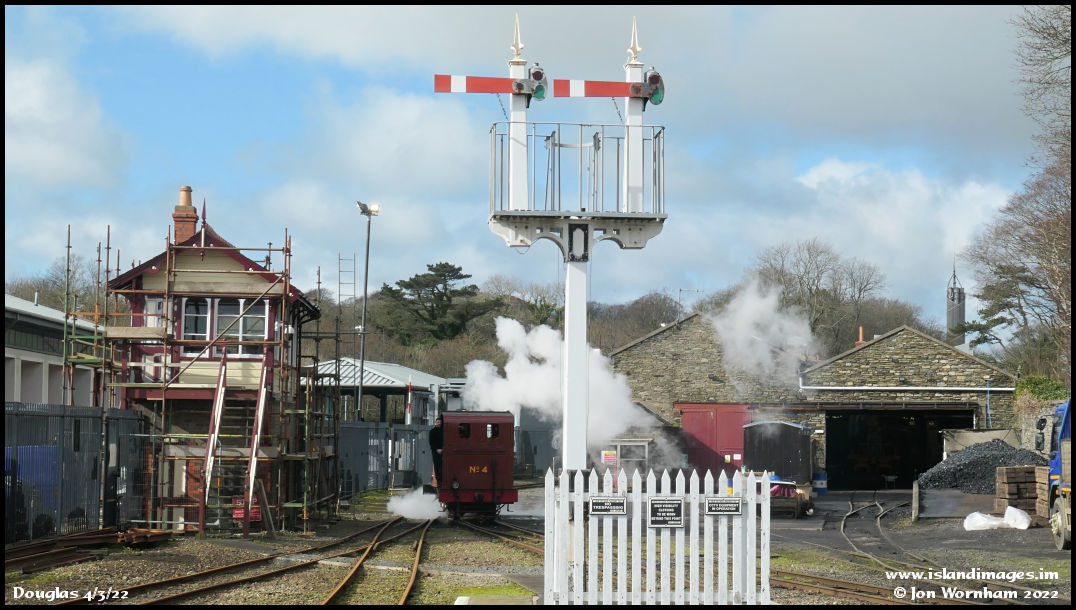 'Loch' sets back towards the train, passing a scaffolding encased signalbox.