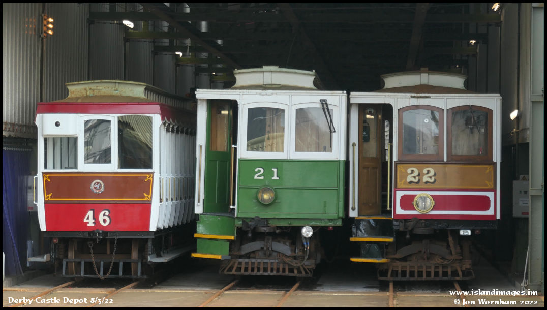 Two of the other 'Winter Saloons', Nos 21 & 22 keep company with trailer No 46 in the running shed. Clearances look a little tight between the power cars!