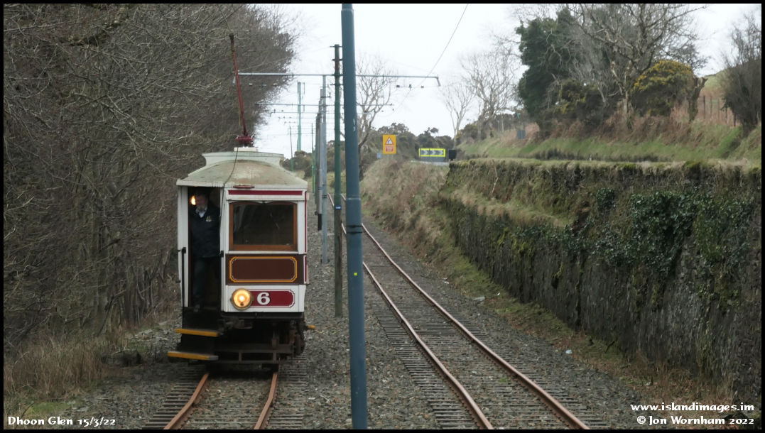 Car No 6 accelerates away, climbing to the summit of the line above Bulgham Bay, before dropping back down to Laxey.