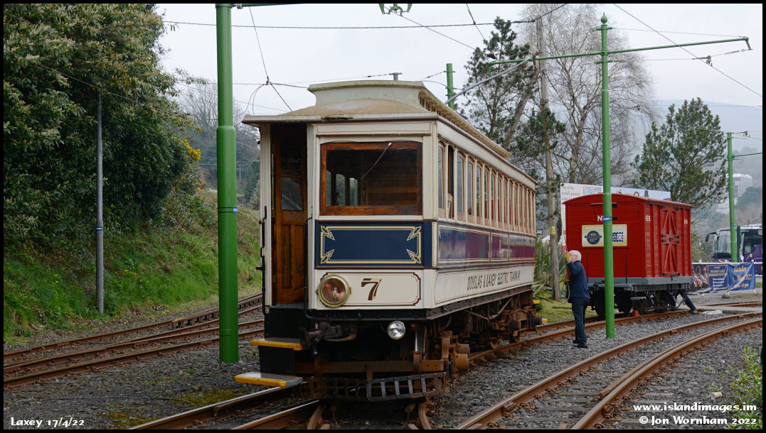 Car No 7 is running around mail van No 4, just outside the station at Laxey.