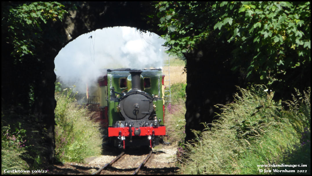 After waiting for some time at the home signal (it was apparently displaying neither 'on' or 'off clearly), No 11 'Maitland' starts into the station. The distortion is heat haze.