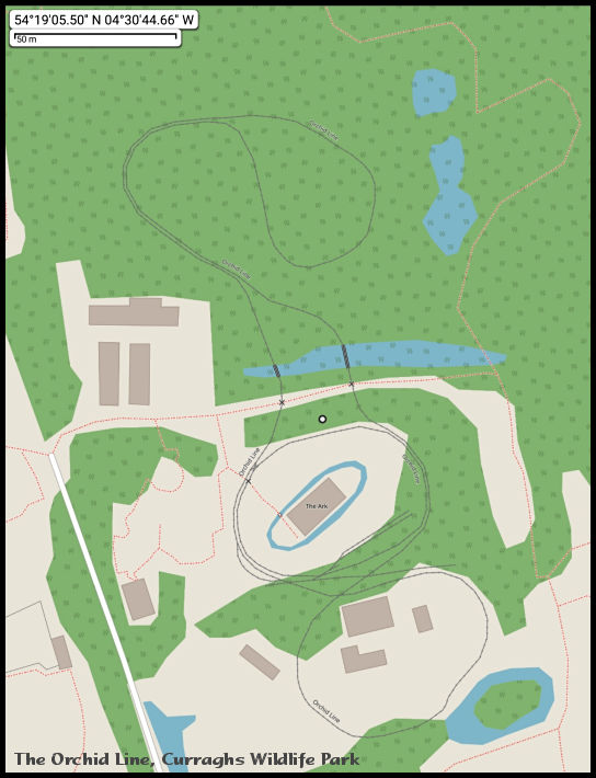 Map showing the complex nature of the Orchid Line miniature railway in the Curraghs Wildlife Park. Not only is the overall line complex, but it's dual gauge throughout, making for some extremely complicated pointwork!