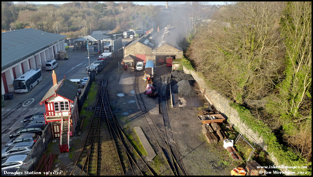 Taking a look down at the engine shed area. The station site used to be considerably larger, with the carriage shed occupying the area on the left where the bus workshops now stand. The signal box was moved to its present postion in the 1990s