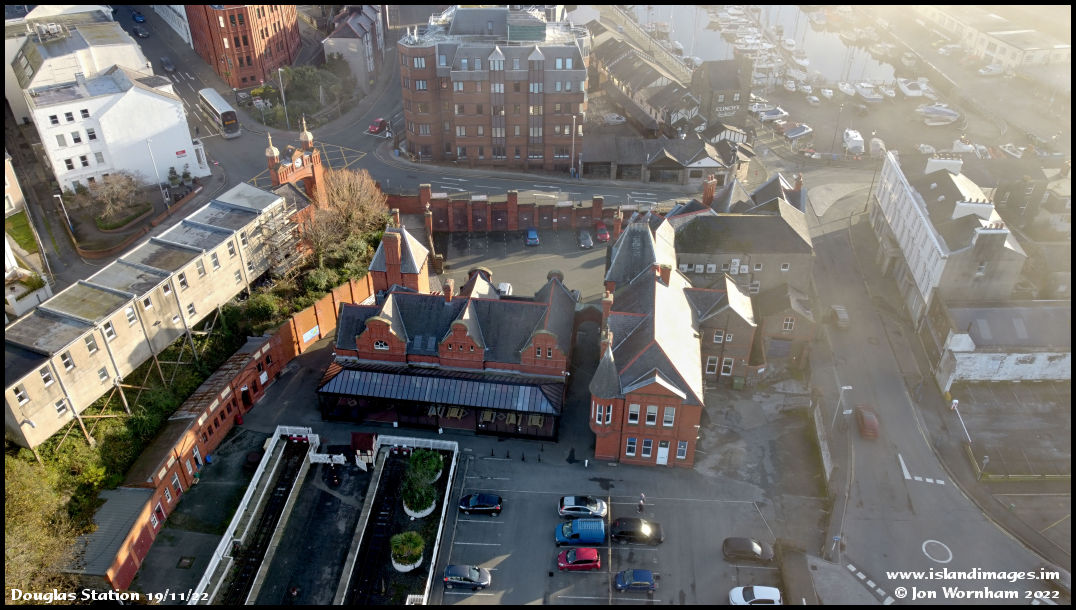 The main station buildings, once the grand headquarters of the Isle of Man Railway. Only two of the original platforms remain, the original south line platforms having been removed to make way for the car park.