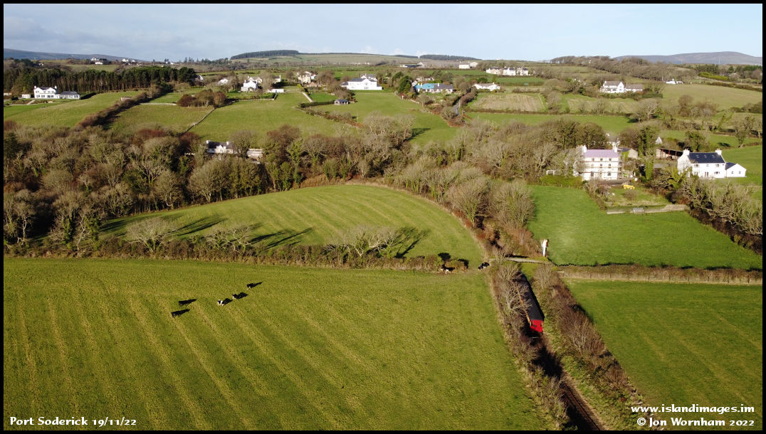 You can only just see the train in the cutting here, but of interest is the Port Soderick home signal, mounted high on the embankment to make it visible over the bridge.