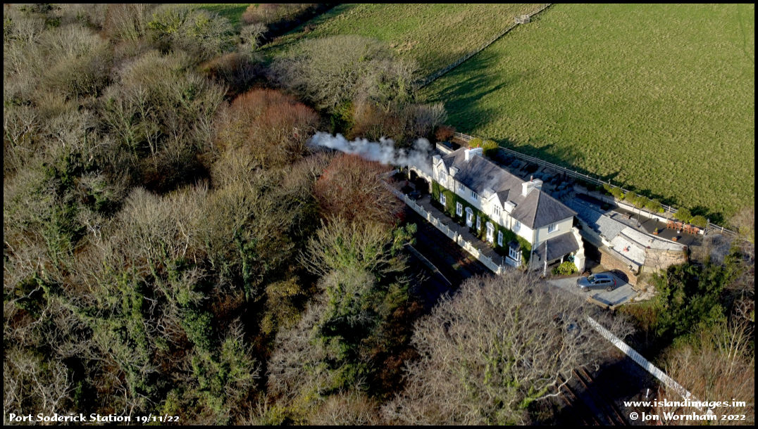 Port Soderick Station. The grand station building is now a private residence, the train is hiding behind the trees, with only smoke and steam visible.