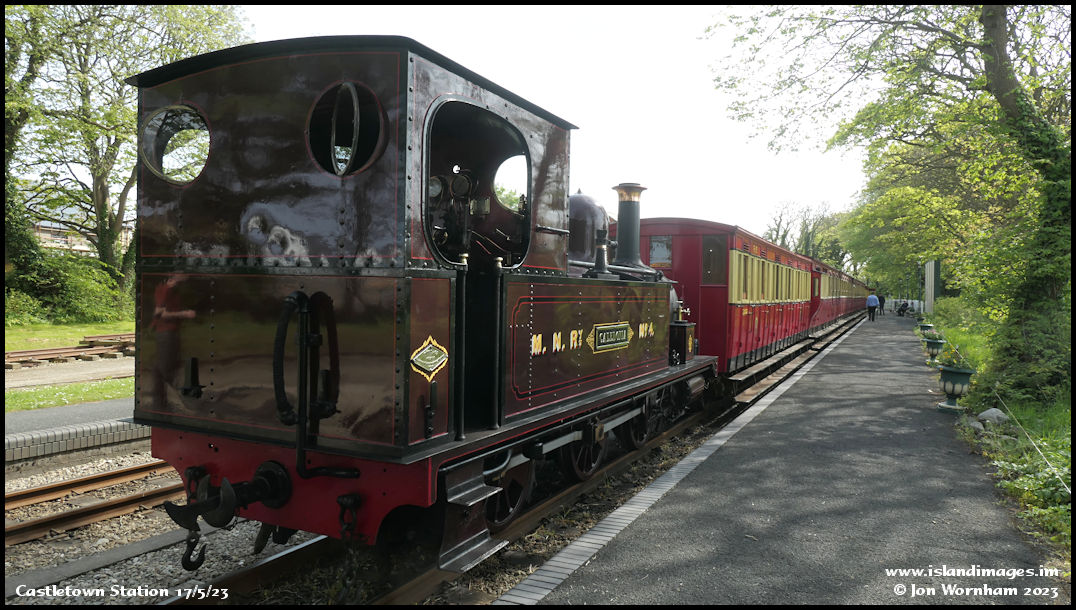 Looking back past 'Caledonia' and her train.  There are (now) no turntables on the railway and tradition has it that the engines run chimney first to Port Erin and bunber first to Douglas.