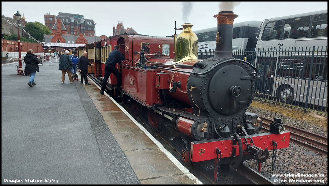 Customers boarding the Dining Car Train in a rather damp Douglas, hauled by No 4 'Loch'