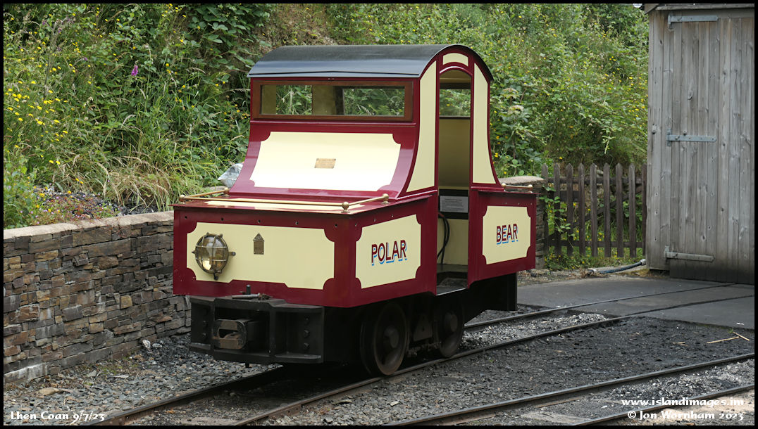On arrival at Lhen Coan station, the train is away up the line, but battery electric loco 'Polar Bear' is stabled outside the engine shed.