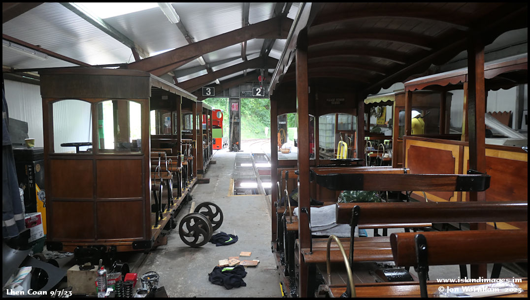 In the carriage shed, the major task under way is replacing the chilled iron wheelsets under the original 1896 carriages (on the left) with ones to a more modern standard.