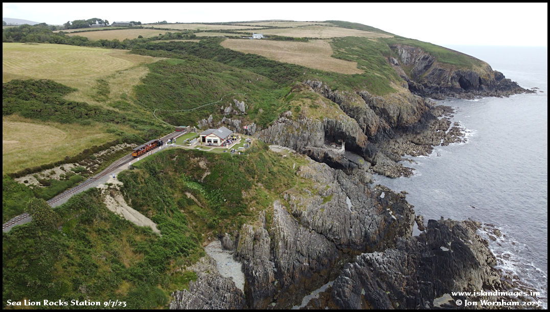 Taking to the air with the mini drone for an aerial look at the railway, here 'Sea Lion' has arrived at the seaward terminus of the line after climbing up from the glen.