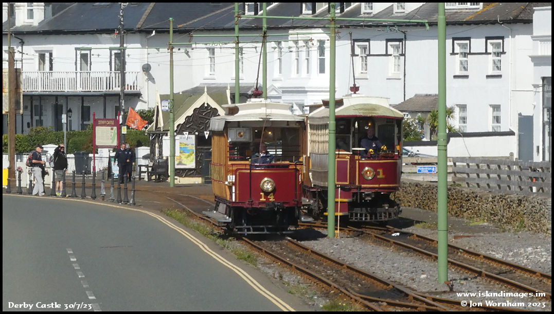 Car No 1 is now departing for Laxey and Ramsey as 'Ratchet Car' No 14 runs into the station area.