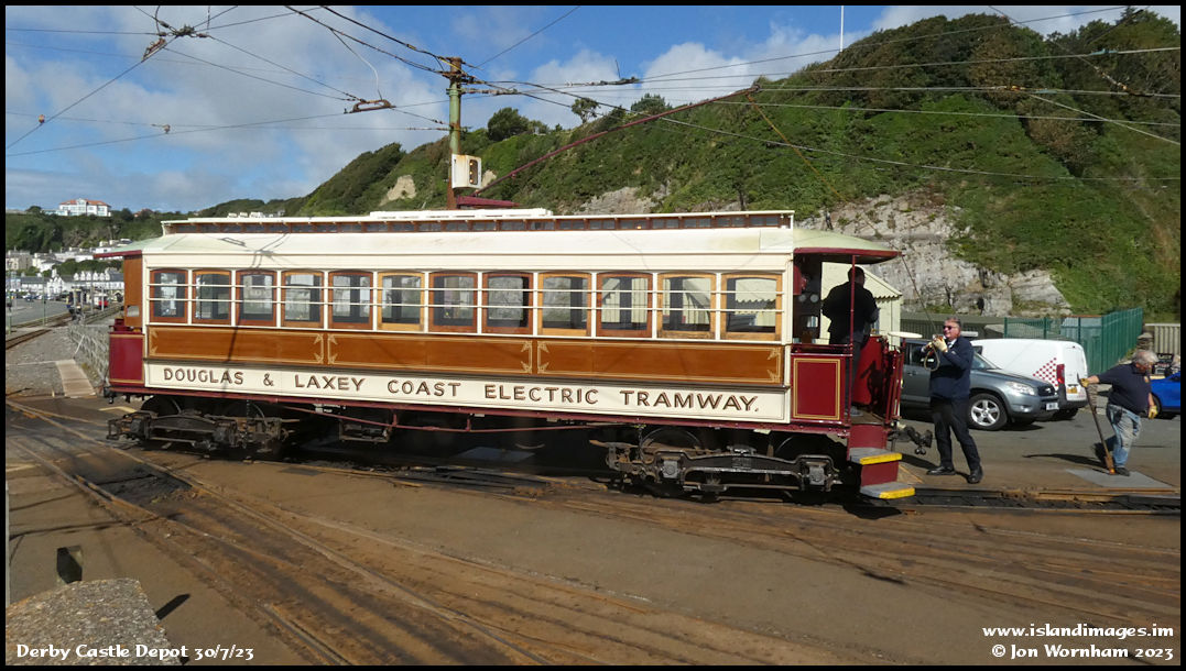 Car No 2 in the depot area about to reverse back and pick up a trailer.  The overhead cables are necessarily complicated here and need some careful working of the trolley pole by the conductor.