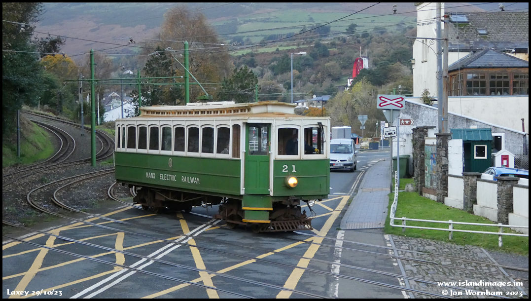 No 21 crossing the main road, with the Snaefell Wheel as backdrop.