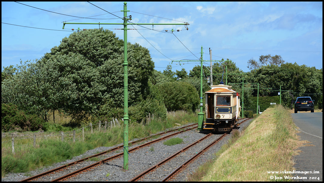 I was drving north to Maughold when I saw a tram approaching passing the Barroose 'egg shack' and pulled over to capture No 7 running alongside the road.