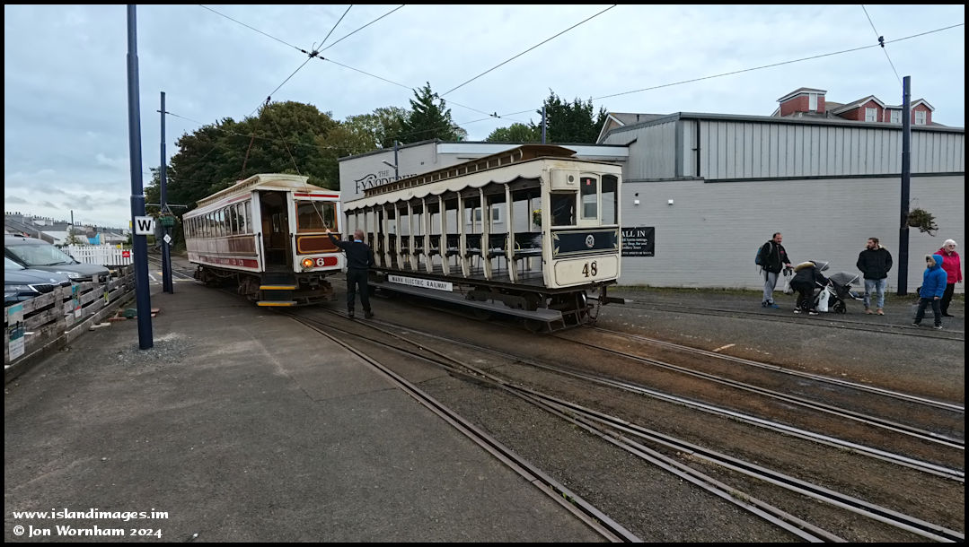 Gravity is used to move the trailer back into the station, with the conductor controlling speed with the handbrake.  The driver is changing round the trolley pole again.